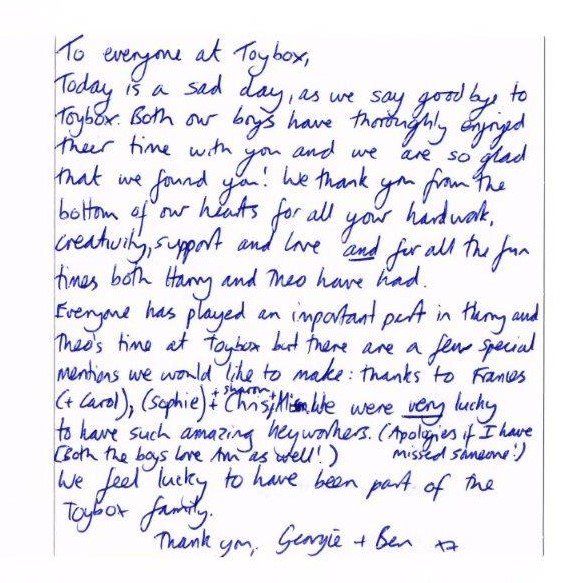Dear Toybox Nursery Staff,